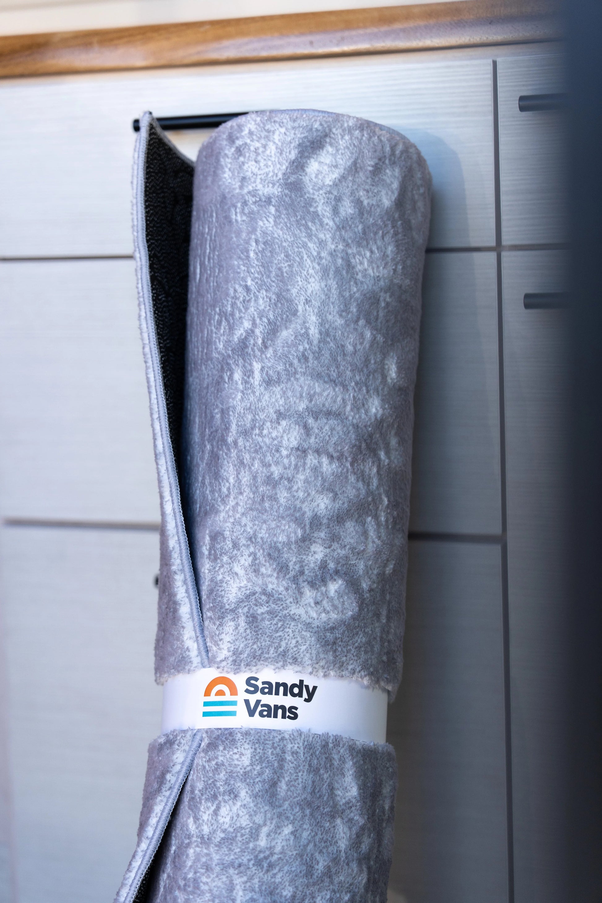 What makes it stand out? No one else sells a rug like this. Designed exclusively by the Sandy Vans team, it’s been an instant hit with van owners looking to elevate their space. The L-shaped design contours effortlessly around your van’s living area, adding warmth, texture, and a polished look. It’s durable enough to handle the wear and tear of life on the road, while still being soft underfoot.